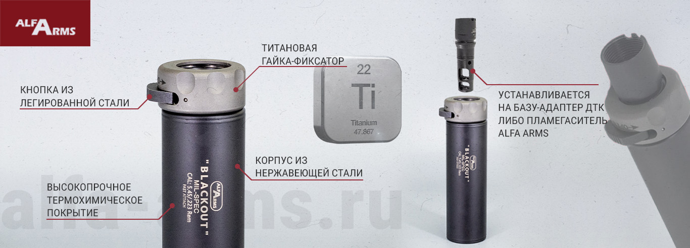 Быстросъемный газоразгруженный ДТКП закрытого типа Alfa Arms Blackout устанавливается на базу-адаптер - дтк либо пламегаситель Alfa Arms. Система быстросъема позволяет оперативно менять конфигурацию оружия в зависимости от тактической задачи.