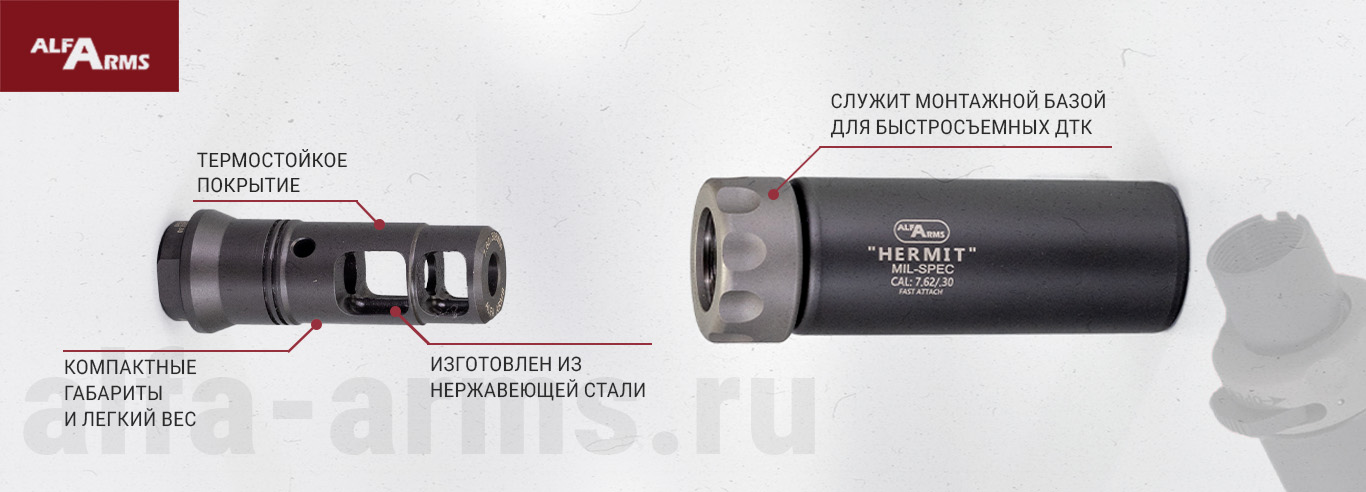 Изделие служит монтажной базой для всех типов ДТК Alfa Arms с быстросъемными креплениями. Имеется технология собственной разработки для регулировки ДТК по вертикали, с помощью применения регулировочных шайб с защитой от прогара.