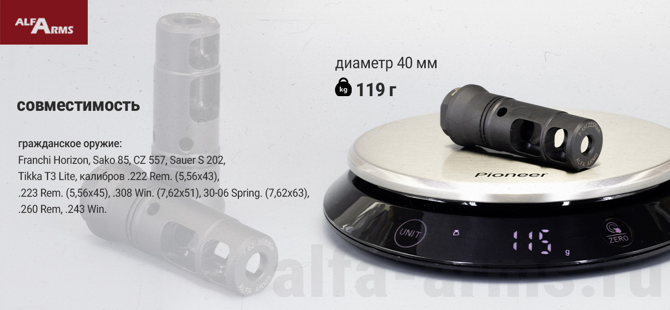 Реактивный ДТК Alfa Arms на Franchi Horizon/Sako 85/CZ 557, создан с акцентом на минимизацию отдачи и улучшение баланса оружия, что позволяет стрелку сохранять высокую точность стрельбы даже при интенсивном использовании.