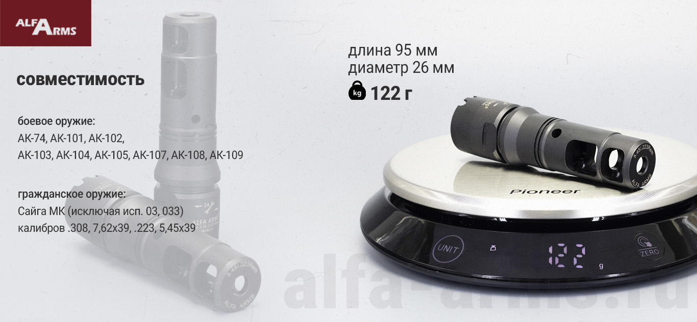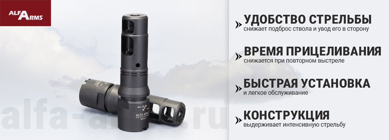 Реактивный ДТК Alfa Arms с наплывом на АК-74/Сайга-МК/АК "Сотая серия", создан с акцентом на минимизацию отдачи и улучшение баланса оружия, что позволяет стрелку сохранять высокую точность стрельбы даже при интенсивном использовании.