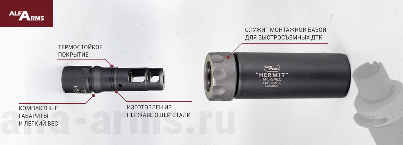 Изделие служит монтажной базой для всех типов ДТК Alfa Arms с быстросъемными креплениями. Имеется технология собственной разработки для регулировки ДТК по вертикали, с помощью применения регулировочных шайб с защитой от прогара.