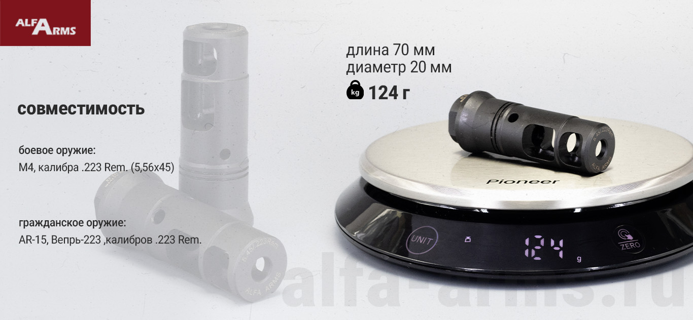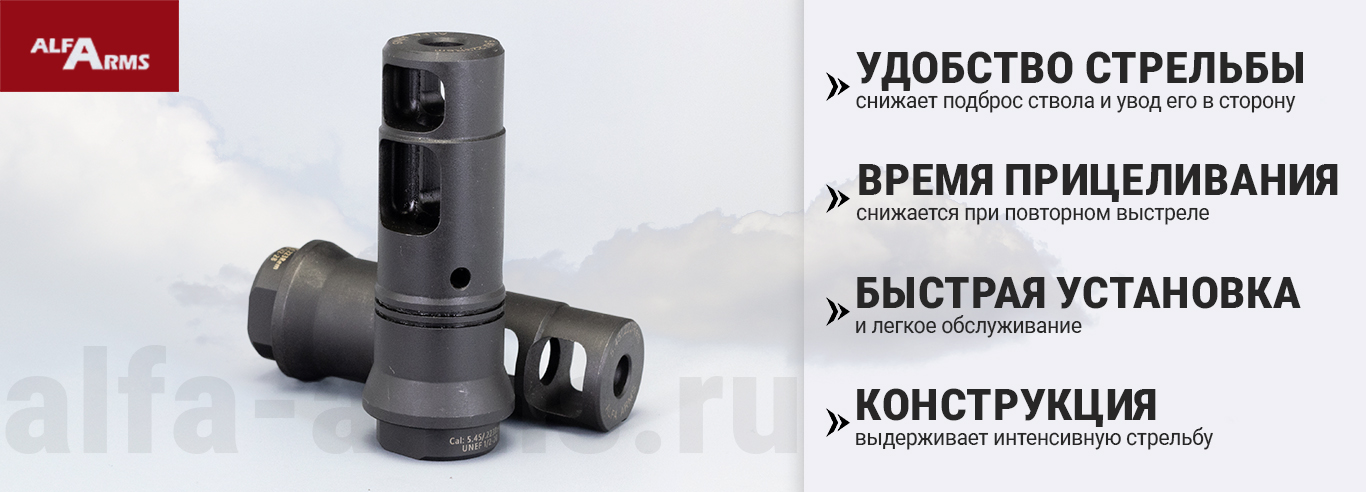 Реактивный ДТК Alfa Arms на AR-15/М4, создан с акцентом на минимизацию отдачи и улучшение баланса оружия, что позволяет стрелку сохранять высокую точность стрельбы даже при интенсивном использовании.