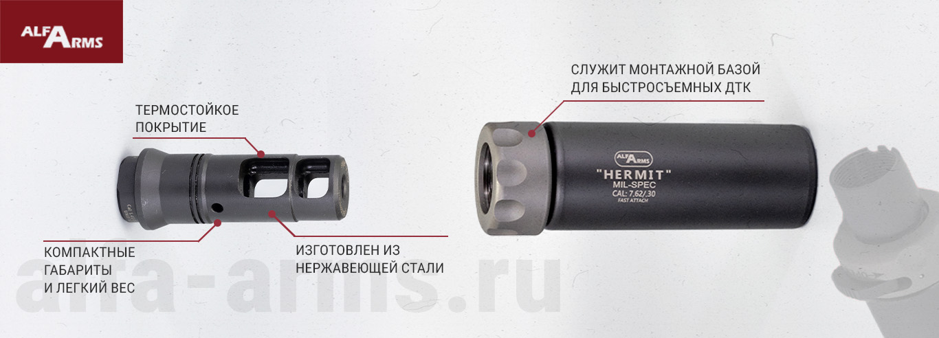 Изделие служит монтажной базой для всех типов ДТК Alfa Arms с быстросъемными креплениями. Имеется технология собственной разработки для регулировки ДТК по вертикали, с помощью применения регулировочных шайб с защитой от прогара.