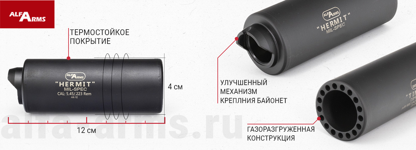 Газоразгруженный дожигатель Alfa Arms "Hermit" — представляет собой инновационное устройство, отличающееся продуманной конструкцией и уникальными техническими решениями. В отличие от стандартных модераторов, "Hermit" использует газоразгруженную систему, которая практически полностью устраняет эффект обратного заброса газов. Это снижает давление и предотвращает подброс оружия при выстреле, делая стрельбу более стабильной и управляемой — особенно в динамичных сценариях.
