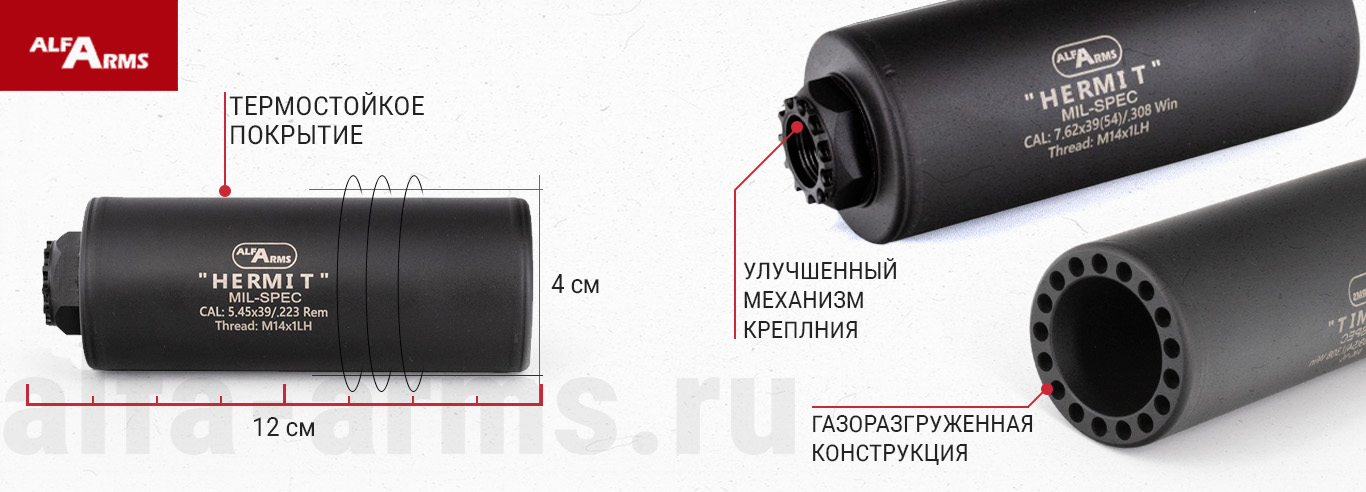 Газоразгруженный дожигатель Alfa Arms "Hermit" — представляет собой инновационное устройство, отличающееся продуманной конструкцией и уникальными техническими решениями. В отличие от стандартных модераторов, "Hermit" использует газоразгруженную систему, которая практически полностью устраняет эффект обратного заброса газов. Это снижает давление и предотвращает подброс оружия при выстреле, делая стрельбу более стабильной и управляемой — особенно в динамичных сценариях.