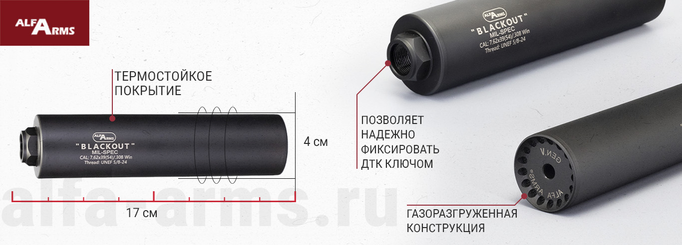 Газоразгруженный ДТКП закрытого типа Alfa Arms на AR10, кал.7,62/308.WIN, разработан специально для использования в армейских и полицейских спецподразделениях. Газоразгруженная конструкция существенно снижает обратный заброс пороховых газов — это снижает риск их попадания в органы зрения и дыхания стрелка. Уменьшается нагрузка на механизмы оружия, благодаря чему использование ДТК с системой газосброса не влияет на ресурс оружия.