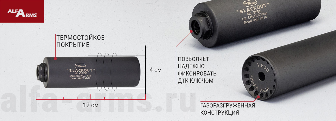 Газоразгруженный ДТКП закрытого типа Alfa Arms на AR15/M4, кал.5,45/.223Rem, разработан специально для использования в армейских и полицейских спецподразделениях. Газоразгруженная конструкция существенно снижает обратный заброс пороховых газов — это снижает риск их попадания в органы зрения и дыхания стрелка. Уменьшается нагрузка на механизмы оружия, благодаря чему использование ДТК с системой газосброса не влияет на ресурс оружия.