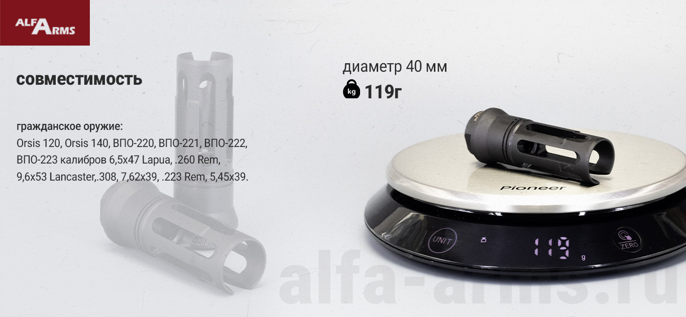 Пламегаситель Alfa Arms "BIRD CAGE" на Orsis 120/140, ВПО-220/221/222/223 - устройство для подавления дульной вспышки, созданное по принципу конструкций типа "bird cage", но с улучшенными характеристиками.