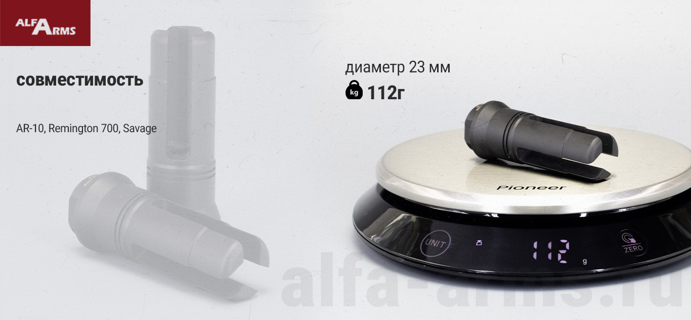 Пламегаситель служит монтажной базой для всех типов ДТК Alfa Arms с быстросъемными креплениями, а так же для локализаторов Alfa Arms.
