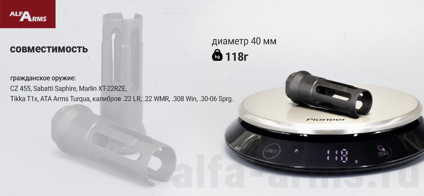 Пламегаситель служит монтажной базой для всех типов ДТК Alfa Arms с быстросъемными креплениями, а так же для локализаторов Alfa Arms.